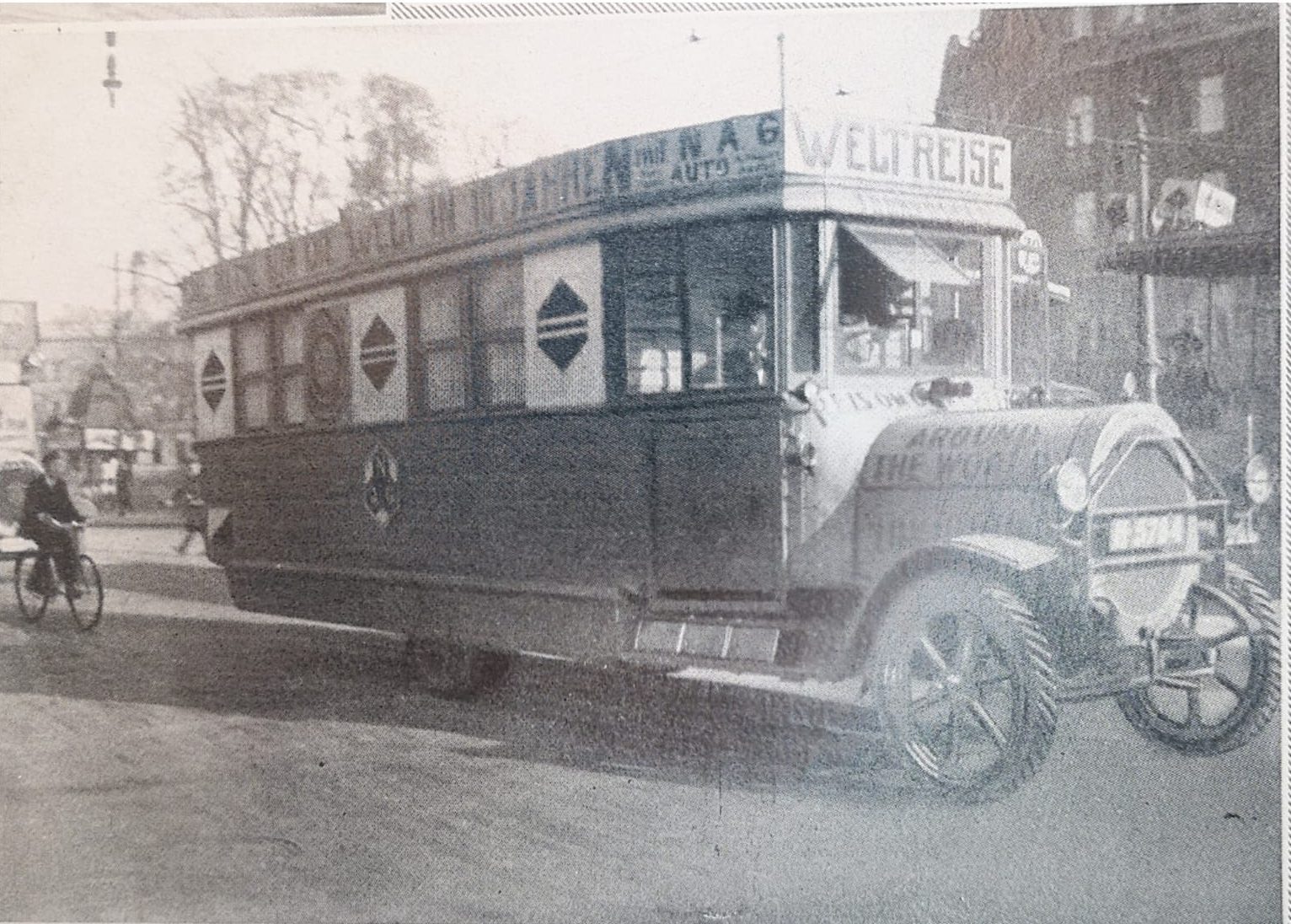 Auf der rechten Abb. ist das N.A. G.-Wohnauto des Herrn Engelsmann dargestellt, der mit seinem Chauffeur in 10 Jahren um die Welt fahren will. Die Fahrt geht über Österreich, Serbien, Bulgarien, Nepal und wird in der nächsten Zeit begonnen.